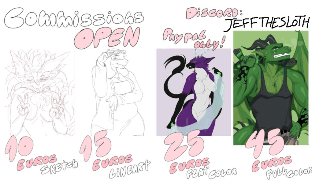 ✧please pay everything in euros to avoid transioctional fees from paypal!------------------------------------------✧There's no refunds after the commission is finished !------------------------------------------✧Please, if I take longer than 1 week with your commission with no contact PLEASE do not be afraid to contact me for updates!discord: jeffthesloth------------------------------------------✧I don't draw bestiality/feral nor real children.(this includes child actors)------------------------------------------✧too overdetailed characters will be charged extra between 5 to 10 euros!------------------------------------------✧Don't commission me stolen characters or characters that aren't yours without permission of the original owner please!------------------------------------------✧I start commissions ONLY after payment !------------------------------------------✧Any changes must be considered in the sketch phase